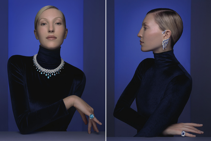 Mineralis set ผลงานไอคอนิกของ “Metaphoria” ที่จับจังหวะอันงดงามของธารน้ำขณะไหลเชี่ยวจากยอดหุบเขามาถ่ายทอด โดดเด่นด้วยดีไซน์แบบอสมมาตร รังสรรค์จากเพชร แซฟไฟร์ อความารีน และหินคริสตัล นอกจากนี้ช่างจิวเวลรี่ยังจับคู่กับหินคริสตัลโปร่งแสง ที่แข่งกันเปล่งประกายราวกับเส้นแสดงขอบเขตของสายน้ำ ขณะที่ธารน้ำที่เชี่ยวกรากถูกนำเสนอผ่านสีสันของแซฟไฟร์สีน้ำเงิน ที่ใช้เทคนิคการฝังอัญมณีแบบกลับด้าน เพื่อส่งมอบชิ้นงานที่ร่วมสมัยไม่เหมือนใคร อัญมณีกลางตัวเรือนตกแต่งด้วยอความารีนเม็ดเขื่อง สี lagoon-blue ทรงหมอน ขนาด 13.25 กะรัต เข้าคู่กับตุ้มหูและแหวนเข้าเซ็ต ประดับแซฟไฟร์จากศรีลังกา ขนาด 4.1 กะรัต