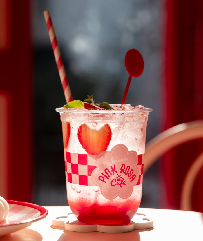 และที่โดดเด่นที่สุดคงหนีไม่พ้น ‘Rainbow Sue’ ที่กำลังสนุกสนานกับการขับขี่ VESPA LX 125 I-GET PINK ROSA เป็นแลนด์มาร์คโดดเด่นอยู่กลางคาเฟ่ ด้วยขนาดที่สูงกว่า 4 เมตร และพิเศษไปกว่านั้นภายในคาเฟ่สีชมพู “Pink Rosa Café” แห่งนี้ VESPA และ Patom Organic Living ได้สร้างสรรค์เมนูขนมหวานและเครื่องดื่ม เพื่อเตรียมต้อนรับชาว VESPISTI ที่ไม่ว่าคุณจะเป็นสายคาเฟ่ สายชิล สายหวาน สายฮิปสเตอร์ หรือสายไหนๆ ก็สามารถมาร่วมสัมผัสความรักและพลานุภาพแห่งสีชมพูผ่านเมนูพิเศษ ให้ทุกรสชาติพาคุณเดินทางท่องไปในโลกสีชมพูแห่งนี้ได้อย่างเป็นอิสระ