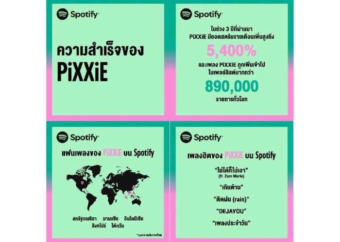 Spotify เป็นส่วนสำคัญในการขยายขอบเขตการเข้าถึงแฟน ๆ ของ PiXXiE ช่วยทำให้ PiXXiE ประสบความสำเร็จอย่างไม่อาจหยุดยั้งได้ ด้วยเพลงฮิตอย่าง “ไม่ได้ไม่ได้เอา (ft. Zom Marie)”, “เกินต้าน”, “ติดฝน (rain)” และ “DEJAYOU” ที่ติดหูตลอดกาล จึงไม่น่าแปลกใจที่เพลงของ PiXXiE จะได้รับความนิยม เห็นได้จากการที่เพลงของพวกเขาถูกเพิ่มเข้าไปยังเพลย์ลิสต์มากกว่า 890,000 รายการทั่วโลก