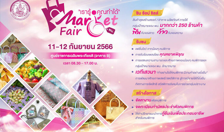 กรมส่งเสริมและพัฒนาคุณภาพชีวิตคนพิการ กระทรวงการพัฒนาสังคมและความมั่นคงของมนุษย์ (พม.) มีความมุ่งมั่นในการส่งเสริมให้คนพิการเข้าถึงสิทธิ สวัสดิการอย่างเท่าเทียมทั่วถึง และเป็นธรรมอย่างยั่งยืน โดยเฉพาะอย่างยิ่งด้านการส่งเสริมให้คนพิการมีงานทำมีรายได้เพียงพอต่อการดำรงชีพ และสามารถดำรงชีวิตในสังคมได้อย่างมีศักดิ์ศรีของความเป็นมนุษย์ จึงได้จัดโครงการ Market Fair “เรารู้ คุณทำได้” โดยมีการจัดแสดงสินค้าและเปิดโอกาสในการจำหน่ายสินค้า ซึ่งเป็นผลิตภัณฑ์ที่ผลิตโดยคนพิการและกลุ่มเป้าหมายของ พม. รวมถึงการจัดมหกรรมอาชีพคนพิการและนัดพบแรงงาน พร้อมมอบประกาศเกียรติคุณยกย่องเชิดชูคนพิการที่ประสบความสำเร็จจากการกู้ยืมเงินเพื่อประกอบอาชีพ ซึ่งกำหนดจัดงานระหว่างวันที่ 11 – 12 กันยายน พ.ศ. 2566 เวลา 08.30 – 17.00 น. ณ ศูนย์ราชการเฉลิมพระเกียรติ (อาคาร B)