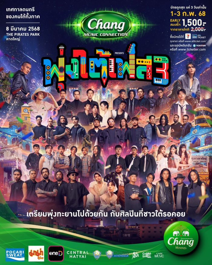 เทศกาลดนตรีที่ยิ่งใหญ่ที่สุดในภาคใต้กลับมาอีกครั้งในปีที่ 3 Chang Music Connection presents “พุ่งใต้เฟส3” พร้อมสร้างปรากฏการณ์ความสนุกสุดมัน! ที่เป็นมากกว่างานดนตรีแต่เป็นเทศกาลแห่งความภาคภูมิใจของชาวใต้ ทุกคนที่จะรวมพลังและหัวใจไว้เป็นหนึ่งเดียวท่ามกลางเสียงเพลงและบรรยากาศแห่งความสุขใจกลางเมืองหาดใหญ่ ร่วมสัมผัสประสบการณ์สุดยิ่งใหญ่ และปลดปล่อยความสนุกไปด้วยกัน ภายใต้การจัดงานโดยทีมผู้จัดALL AREA จาก GMM SHOW ในวันเสาร์ที่ 8 มีนาคม 2568 ณ สวนน้ำ เดอะไพเรท ปาร์ค หาดใหญ่ (The Pirates Park Hatyai)