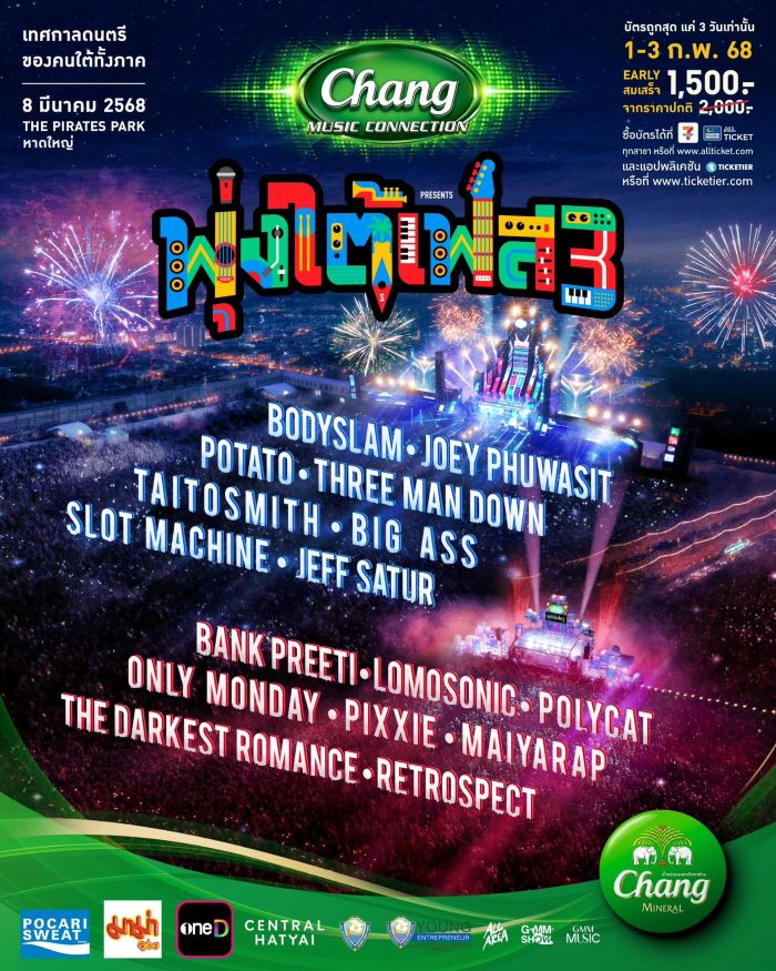 ห้ามพลาด! 1 ปีมีครั้งเดียว รวมพลังชาวใต้ให้เป็นหนึ่ง แล้วมากระโดดกับเสียงเพลงกลางเมืองหาดใหญ่ ไปด้วยกันกับเทศกาลดนตรีของชาวใต้ทั้งภาค Chang Music Connection presents“พุ่งใต้เฟส 3” จัดขึ้นในวันเสาร์ที่ 8 มี.ค. 2568 สวนน้ำ เดอะไพเรท ปาร์ค หาดใหญ่ (The Pirates Park Hatyai) จำหน่ายราคาพิเศษถูกที่สุด 3 วันเท่านั้น!!! 1-3 กุมภาพันธ์ 2568 บัตร Early สมเสร็จ ราคา 1,500 บาท (จากปกติ 2,000 บาท) ที่ www.allticket.com และ เคาน์เตอร์เซอร์วิส All Ticket ในร้าน 7-Eleven ทุกสาขาทั่วประเทศ และที่ www.TICKETIER.com หรือแอปพลิเคชั่น TICKETIER