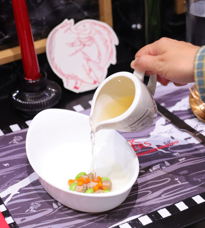 • Omega Pork Spare Ribs in French Consommé Soup การผสมผสานระหว่างอาหารสไตล์ฝรั่งเศสและไทย ด้วยการนำซุปที่เคี่ยวมาจากซี่โครงหมู เติมรสชาติของขิงเบาๆ ให้ความรู้สึกสดชื่น ราดลงไปบนเนื้อหมูพอร์ค แมทเตอร์ ที่ถูกหั่นเป็นลูกเต๋า เสิร์ฟคู่ถั่วแระญี่ปุ่นและแคร์รอต