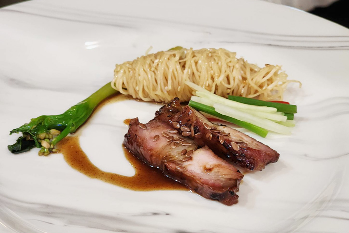 • Smoke Hong Kong Style Char-Siu Omega Pork Collar with Wild Flower Honey | Chili Oil Noodle เมนูสไตล์ฮ่องกงที่นำหมูโอเมก้าพอร์ค แมทเตอร์ ส่วนสันคอ มาทำเป็นสันคอหมูแดง เสิร์ฟพร้อมคะน้าฮ่องกง ผัดน้ำมันหอย และบะหมี่ ที่คลุกเคล้ากับน้ำมันพริกให้มีความหอมมากขึ้น เติมความสมบูรณ์ด้วยเครื่องเคียงอย่าง พริก แตงกวา และต้นหอม