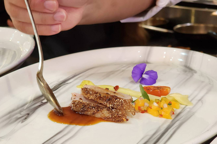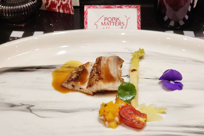 • Charcoal Grilled Omega Pork Jowl with Jaew Sauce | Glazed White Asparagus | Marian Plum Salsa เมนูสไตล์ไทยที่นำคอหมูย่างมาราดด้วยซอสน้ำจิ้มแจ่ว ซึ่งมีความหอมของข้าวคั่วสไตล์น้ำจิ้มแจ่วที่คนไทยคุ้นเคย เสริฟคู่กับมะยงชิดซัลซา