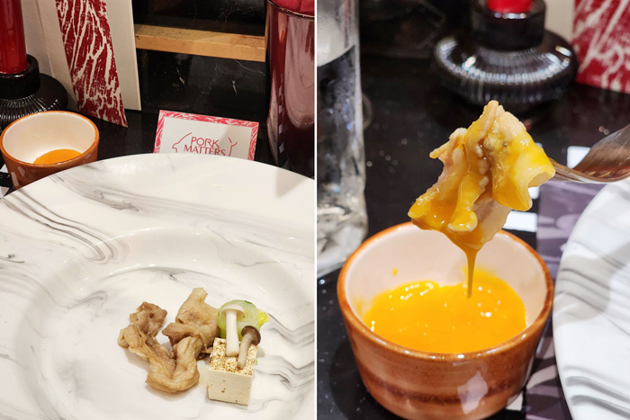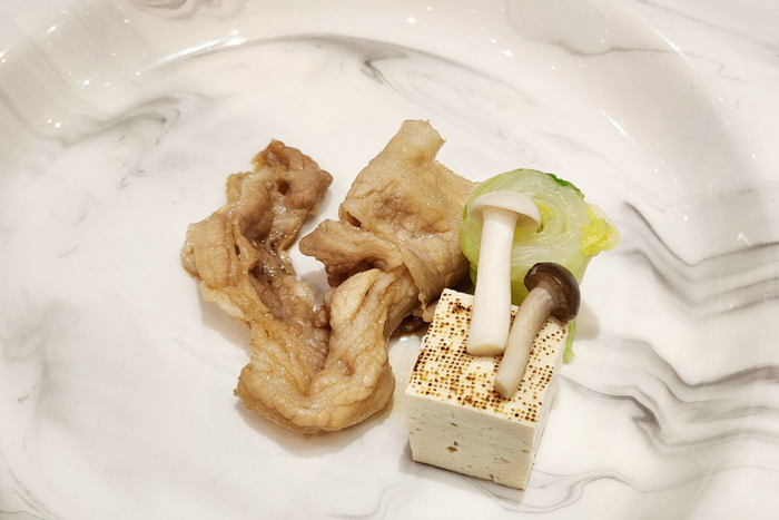 • Omega Pork Belly Sukiyaki | Fresh Rich Yolk | Veggi Mori เชฟปอนด์เลือกหมูโอเมก้า พอร์ค แมทเตอร์ ส่วนท้องมาสไลด์บางๆ เสิร์ฟคู่เต้าหู้ที่ทำการเบิร์นให้มีกลิ่นหอม พร้อมเครื่องเคียงเป็นผักกาดขาวม้วนเห็ด เสิร์ฟในสไตล์ญี่ปุ่น