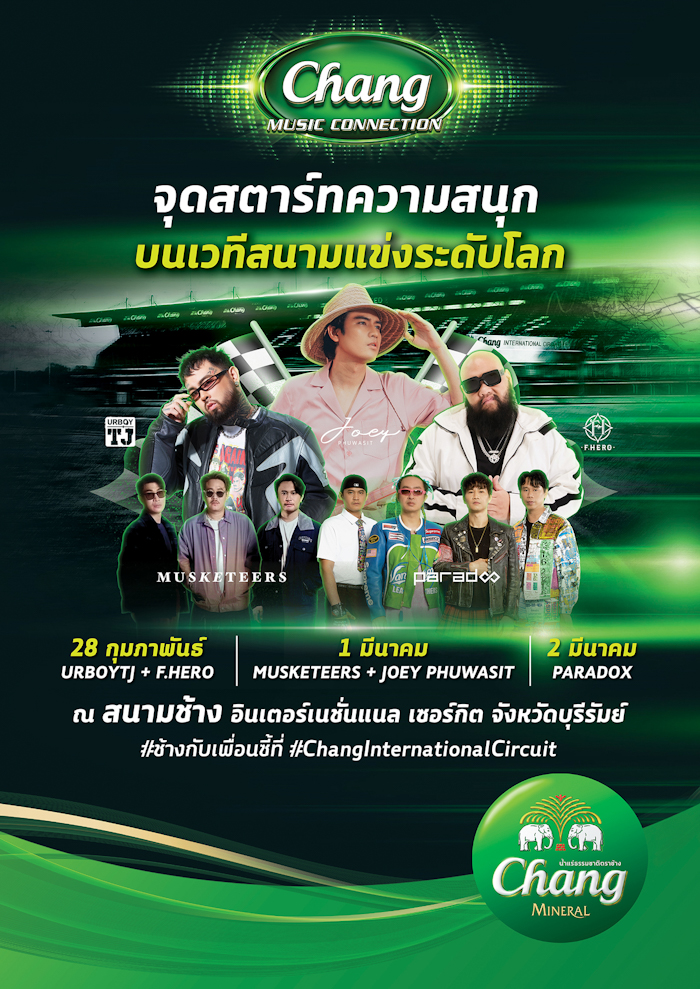 ฝ่ายจัดเผย นอกจากแฟนความเร็วจะสนุกกับการแข่งขันในสนามที่เข้มข้น กิจกรรมภายในงานยังครบเครื่องไปด้วย เทศกาลดนตรี-มวย-เอ็กซ์โป ล่าสุด “น้ำแร่ธรรมชาติ ตรา ช้าง” ยังได้ยกทัพศิลปินดัง ไปร่วมส่งมอบความสุขความประทับใจ ด้วยคอนเสิร์ตสุดยิ่งใหญ่ Chang Music Connection กับเพลงดังหลากหลายแนว ได้แก่