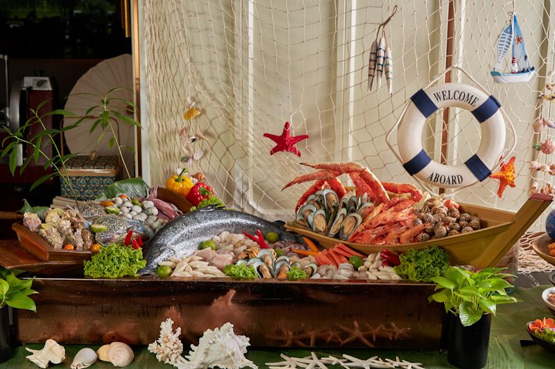 ธีม ทะเลไทย จัดทุกคืนวันศุกร์ เริ่มตั้งแต่วันศุกร์ที่ 2 สิงหาคม 2567 พร้อมเสิร์ฟปลาและหอยสด ๆ จากตลาดซีฟู้ดและเมืองชายฝั่งทะเลของไทย เพื่อนำเสนออาหารทะเลไทยที่ดีที่สุด เมนูไฮไลท์ ได้แก่ ปลาย่างใบตองอ่อน ผัดไทยกุ้งสดหอมอร่อย กุ้งเทอร์มิดอร์ ราดชีสกรุยแยร์เยิ้ม ๆ ผสมรสอ่อน ๆ ของมัสตาร์ดดิฌง ต่อด้วยแกงเผ็ดน้ำกะทิ ใส่กุ้ง ปลาหมึก หอย และปลา ราคาเริ่มต้น 2,100 บาทต่อท่าน รวมเครื่องดื่มม็อกเทล สำหรับเด็กอายุ 6-11 ปี ราคา 1,050 บาท และเด็กอายุต่ำกว่า 5 ปี ไม่เสียค่าใช้จ่าย