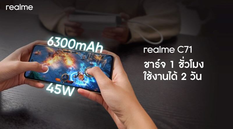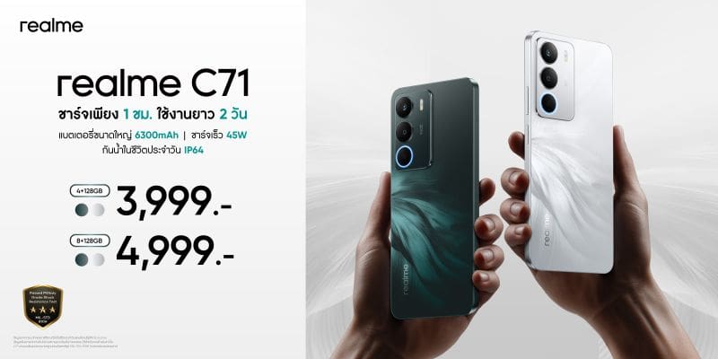 realme แบรนด์สมาร์ตโฟนเพื่อคนรุ่นใหม่ เปิดตัว realme C71 อย่างเป็นทางการในประเทศไทย เสริมทัพสมาร์ตโฟนกลุ่มเริ่มต้นด้วยนิยามใหม่ “เบาแต่แรง อึดแต่บาง” โดดเด่นด้วยดีไซน์เพรียวบางทันสมัย พร้อมสเปกระดับท็อปในกลุ่ม ไม่ว่าจะเป็น ตัวเครื่องบางเพียง 7.79 มม. น้ำหนักเพียง 196 กรัม แบตเตอรี่ใหญ่ถึง 6,300mAh ชาร์จไว 45W และ ระบบ AI อัจฉริยะ ที่ช่วยยกระดับประสบการณ์การใช้งานในทุกมิติ ในราคาสบายกระเป๋าเริ่มต้นเพียง 3,999 บาท
