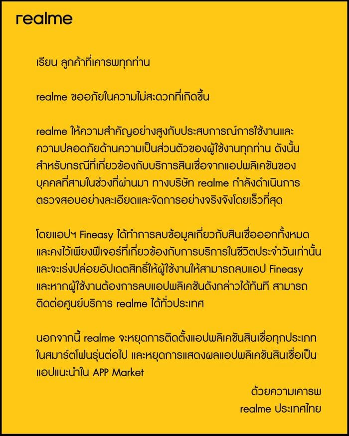 เอกสารสำหรับการอนุมัติการติดตั้งล่วงหน้าที่ส่งมายัง realme โดยแอปพลิเคชันสินเชื่อความสุข และแอปพลิเคชันที่เกี่ยวข้องกับสินเชื่ออื่น ๆ นั้น ถือว่าครบถ้วนและเป็นไปตามข้อกำหนดในช่วงเวลาที่เราทำการตรวจสอบ อย่างไรก็ดี เมื่อได้รับข้อร้องเรียนจากผู้ใช้งานเกี่ยวกับแอปพลิเคชันนี้ ทาง realme รู้สึกเสียใจเป็นอย่างยิ่งต่อความวิตกกังวลที่เกิดขึ้น และทำให้เราได้ดำเนินการเพื่อลบแอปพลิเคชันนี้โดยเร่งด่วน และเรายินดีให้ความร่วมมือกับหน่วยงานที่เกี่ยวข้องในการสอบสวนอย่างเต็มที่