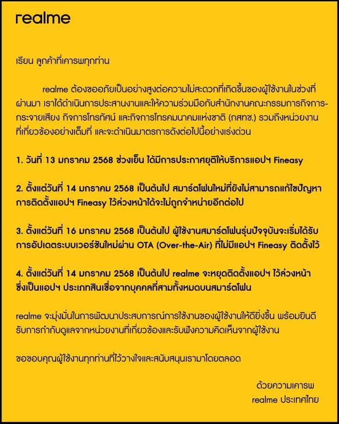 realme ได้ยุติการติดตั้งแอปพลิเคชัน Fineasy ในโทรศัพท์รุ่นใหม่ทั้งหมดที่วางจำหน่ายตั้งแต่วันที่ 14 มกราคม 2568 ที่ผ่านมา สำหรับผู้ใช้งานปัจจุบัน บริษัทฯ จะทยอยส่งการอัปเดตซอฟต์แวร์เวอร์ชันใหม่ผ่านระบบ OTA ตั้งแต่วันที่ 15 มกราคม 2568 เป็นต้นไป เพื่อถอนแอปพลิเคชันออกจากอุปกรณ์ของท่าน (ตามตารางการอัปเดตซอฟต์แวร์)