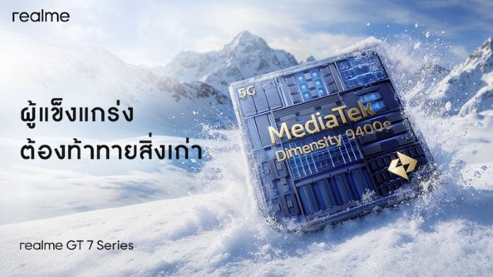realme GT 7 ยังเป็นสมาร์ตโฟนรุ่นแรกในประเทศไทย ที่ได้ใช้ชิปเซตเรือธงรุ่นใหม่ MediaTek Dimensity 9400e ซึ่งพัฒนาบนเทคโนโลยีระดับ 4 นาโนเมตรของ TSMC มอบประสิทธิภาพแรงติดท็อป 3 ของสมาร์ตโฟนแอนดรอยด์ในปีนี้