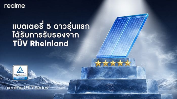พร้อมเทคโนโลยี Smart Bypass ช่วยลดความร้อนพร้อมยืดอายุแบตเตอรี่ ซึ่งโซลูชันการชาร์จที่เปี่ยมประสิทธิภาพนี้ ทำให้ realme GT 7 เป็นสมาร์ตโฟนรุ่นแรกของโลกที่ได้รับมาตรฐาน TÜV Rheinland ด้านระบบพลังงานระดับ 5 ดาว