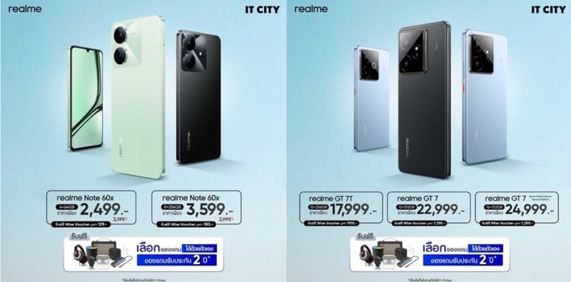 - realme GT 7T 5G (12+256GB) ราคา 17,999 บาท รับฟรี Wise Voucher มูลค่า 900 บาท
