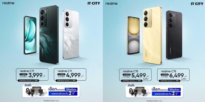 - realme C71 (8+128GB) ราคา 4,999 บาท รับฟรี Wise Voucher มูลค่า 250 บาท