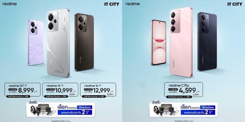 - realme 14T 5G (8+256GB) ราคา 8,999 บาท รับฟรี Wise Voucher มูลค่า 500 บาท