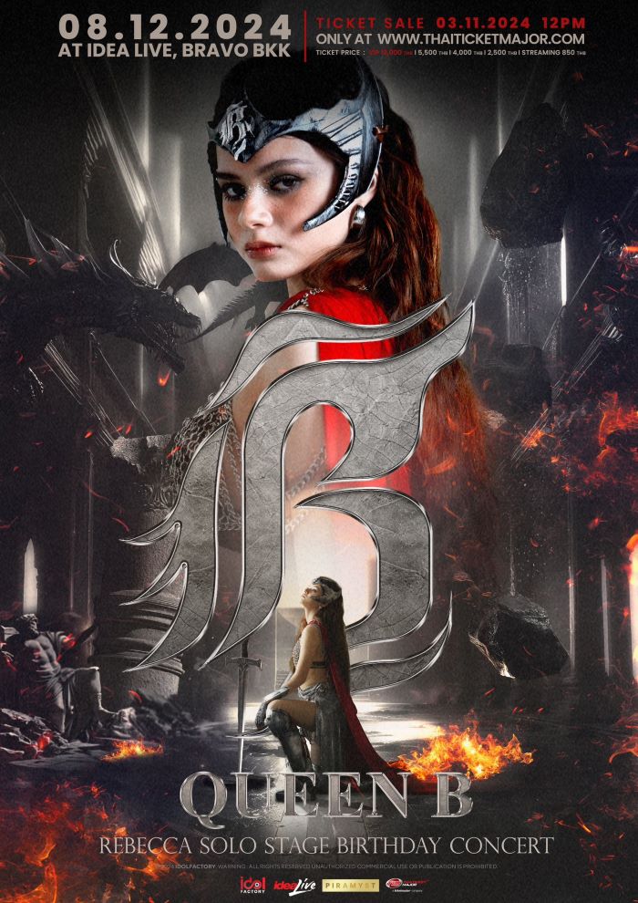 Rebecca solo stage birthday concert “Queen B” จะจัดขึ้นในวันอาทิตย์ที่ 8 ธันวาคม 2567 นี้ ณ idea Live, BRAVO BKK บัตรราคา 5,500 บาท / 4,000 บาท / 2,500 บาท และบัตร Live Stream 850 บาท พิเศษกับ Zone VIP Lounge 12,000฿ จำหน่ายบัตร 3 พฤศจิกายน นี้ เป็นต้นไปทาง Thaiticketmajor.com