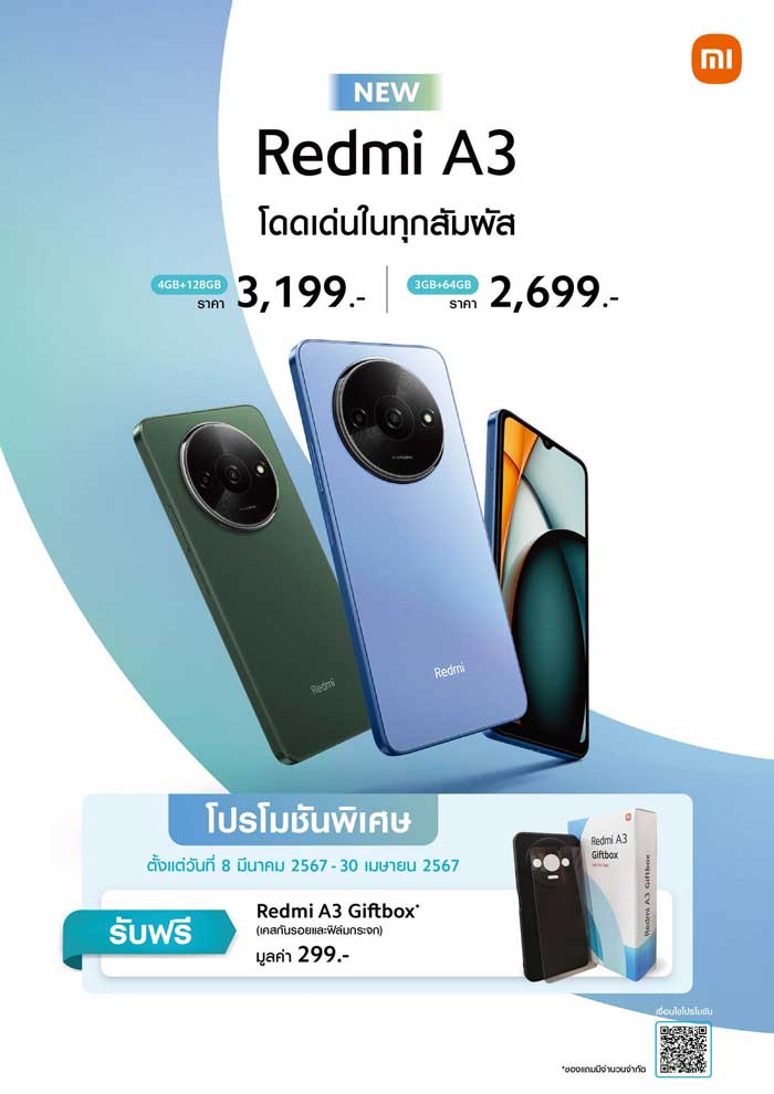 พิเศษ! สำหรับลูกค้าที่ซื้อ Redmi A3 ในระหว่างวันที่ 8 มีนาคม 2567 – 30 เมษายน 2567 รับฟรี Redmi A3 Giftbox มูลค่า 299 บาท1