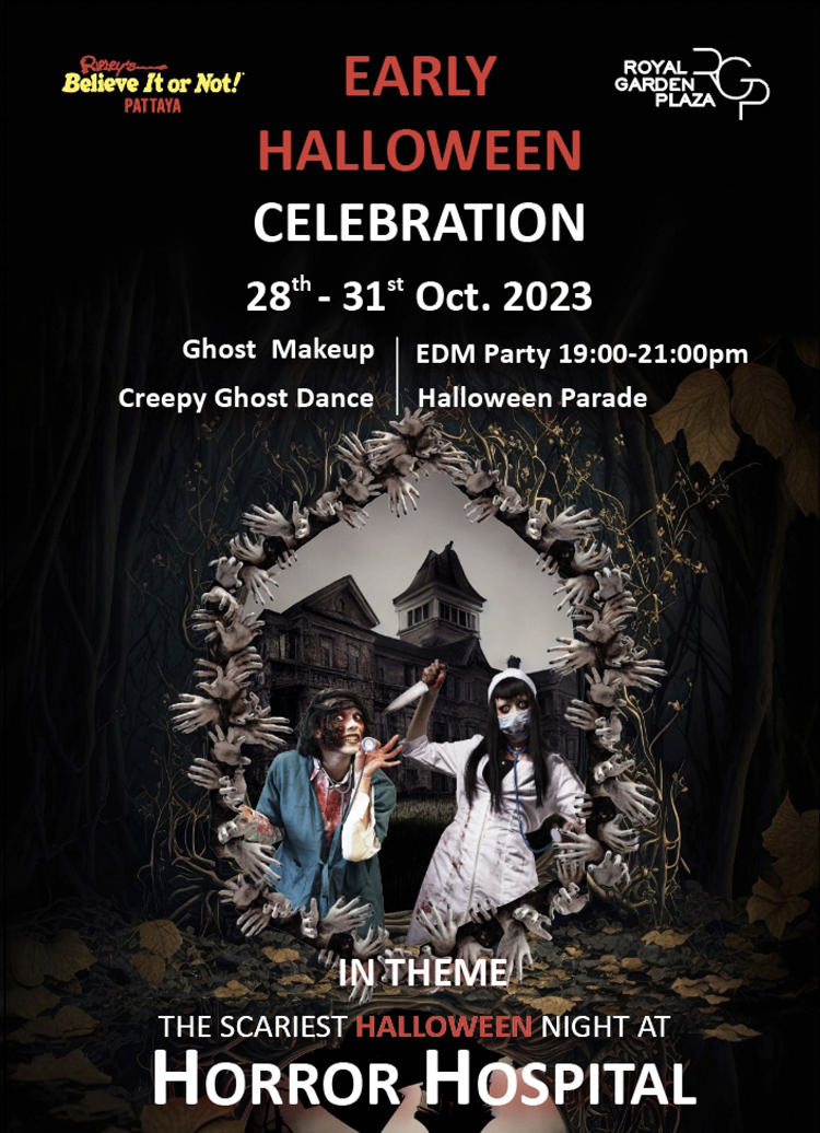 28 – 31 ตุลาคมนี้ Ripley’s Believe It or Not! Pattaya ขอต้อนรับท่านสู่เทศกาลสุดสยองขวัญ ประจำปี ในธีม “คืนฮาโลวีนกระตุกขวัญกับโรงพยาบาลสุดหลอน” และเพื่อเป็นการฉลองถึงความสำเร็จของ Horror Hospital โรงพยาบาลหลอน กับรางวัล “Creative Tourist Attraction Award 2023”