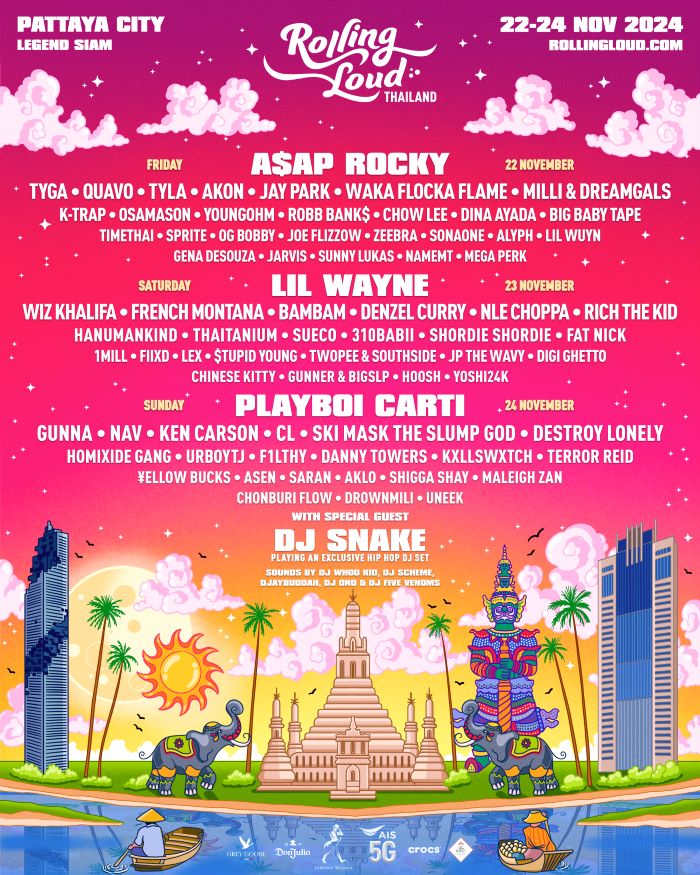 “Rolling Loud Thailand 2024” มอบโอกาสสุดพิเศษให้เหล่าแฟนเพลงฮิปฮอปทั้งในเอเชียและนักท่องเที่ยวจากทั่วทุกมุมโลกได้ชมศิลปินจากฝั่งตะวันตกและฝั่งอเมริกาที่เป็นไอค่อนและเป็นที่ชื่นชอบบนเวทีเดียวกับศิลปินจากประเทศไทย อาทิ Gunna, Quavo, NAV และ Ski Mask The Slump God ศิลปินรุ่นเก๋าอย่าง Wiz Khalifa, Tyga, Akon, French Montana และ Waka Flocka Flame ศิลปินสุดเดือดที่พร้อมทำให้สเตจลุกเป็นไฟอย่าง Denzel Curry, NLE Choppa, Ken Carson และ 310babii ศิลปินระดับตำนานอย่าง K-Trap แร็ปเปอร์ชาวอังกฤษ และศิลปินดาวรุ่งอย่าง OsamaSon และ Chow Lee “Rolling Loud Thailand 2024” ถือเป็นการเปิดตัวครั้งแรกของดีเจและโปรดิวเซอร์ระดับซูเปอร์สตาร์อย่าง DJ Snake และเจ้าหญิงเพลงฮิต “Water” ชาวแอฟริกาใต้อย่าง Tyla