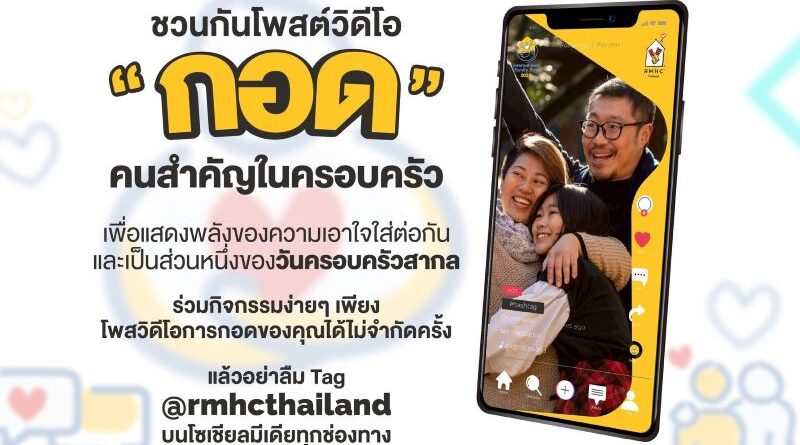 มูลนิธิโรนัลด์ แมคโดนัลด์ เฮาส์ หรือ หรือ RMHC ร่วมฉลองวันครอบครัวสากล (International Family Day) ชวนคนไทย ‘กอด’ เติมกำลังใจ กับ แคมเปญสุดฮีลใจ ‘RMHC Hug Challenge’ เพื่อเสริมสร้างความรัก เติมความสัมพันธ์อันใกล้ชิดระหว่างคนในครอบครัวให้แข็งแกร่ง และส่งต่อพลังบวกเพื่อให้ทุกครอบครัวได้อยู่ใกล้ชิดกัน