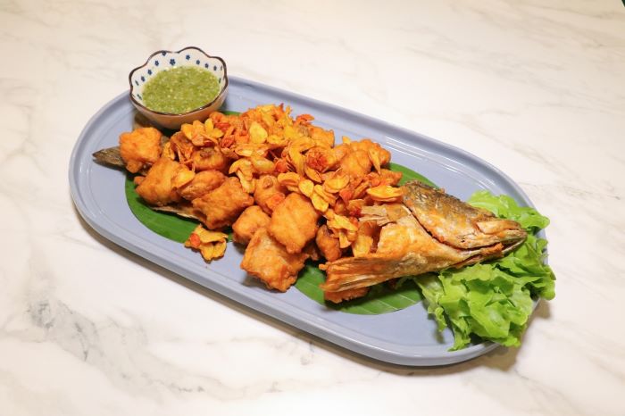 ปลากะพงทอดขมิ้น ปลากะพงทอดตัวโต ๆ ที่ผ่านการหมักขมิ้น มาพร้อมเนื้อปลาหั่นเป็นลูกเต๋าทำให้กินง่าย และยิ่งทานคู่กับน้ำจิ้มซีฟู้ด ซึ่งเป็นสูตรโฮมเมดของร้านบอกเลยว่าอร่อยลงตัวสุด ๆ