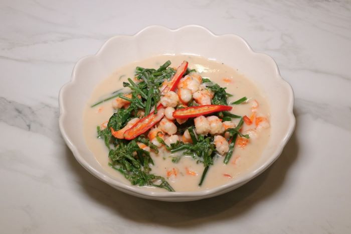 ผักกูดกะทิกุ้งสับ เมนูเอาใจคนไม่ทานเผ็ด หอมมันเข้มข้นของกะทิ กะปิ และผักกูดที่ต้มมากำลังดี และกุ้งสับที่สด เรียกว่าอร่อยลงตัว รสชาติกลมกล่อมกำลังดีไม่มากไม่น้อย