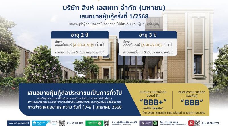 หลังจากประสบความสำเร็จจากการเสนอขายหุ้นกู้ในปี 2566 และเมื่อช่วงต้นปี 2567 ที่ผ่านมา โดยมีมูลค่าการเสนอขายหุ้นกู้ทั้ง 2 ครั้งรวมมูลค่าเสนอขายทั้งสิ้น 2,700 ล้านบาท บริษัท สิงห์ เอสเตท จำกัด (มหาชน) หรือ “S” เตรียมพร้อมที่จะเสนอขายหุ้นกู้ชุดใหม่ต่อประชาชนเป็นการทั่วไป โดยปัจจุบันบริษัทฯ อยู่ระหว่างการยื่นแบบแสดงรายการข้อมูลตราสารหนี้ (filing) เพื่อเสนอขายหุ้นกู้ชนิดระบุชื่อผู้ถือ ประเภทไม่ด้อยสิทธิ ไม่มีประกัน และมีผู้แทนผู้ถือหุ้นกู้ ต่อสำนักงานคณะกรรมการกำกับหลักทรัพย์และตลาดหลักทรัพย์ (ก.ล.ต.) โดยหุ้นกู้ดังกล่าวแบ่งออกเป็น 2 ชุด ได้แก่ ชุดที่ 1 หุ้นกู้อายุ 2 ปี อัตราดอกเบี้ย [4.50 – 4.70]% ต่อปี และ ชุดที่ 2 หุ้นกู้อายุ 3 ปี อัตราดอกเบี้ย [4.90 -5.10]% ต่อปี สำหรับหุ้นกู้ดังกล่าวจะชำระดอกเบี้ยทุก ๆ 3 เดือน กำหนดจองซื้อขั้นต่ำ 100,000 บาท ทวีคูณครั้งละ 100,000 บาท โดยคาดว่าจะเสนอขายต่อประชาชนเป็นการทั่วไประหว่างวันที่ [7 – 9] มกราคม 2568 ทั้งนี้ บริษัทฯ ได้แต่งตั้งสถาบันการเงิน 4 แห่ง เป็นผู้จัดการการจัดจำหน่ายหุ้นกู้ ประกอบด้วย ธนาคารกรุงไทย ธนาคารกสิกรไทย บริษัทหลักทรัพย์ เกียรตินาคินภัทร และธนาคารซีไอเอ็มบี ไทย