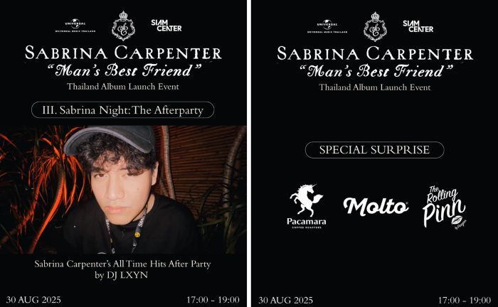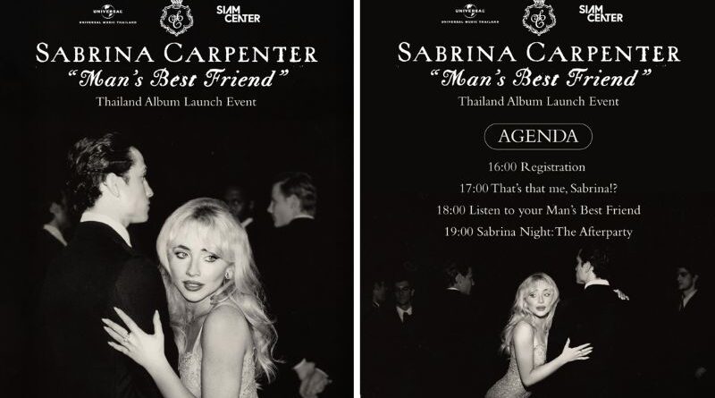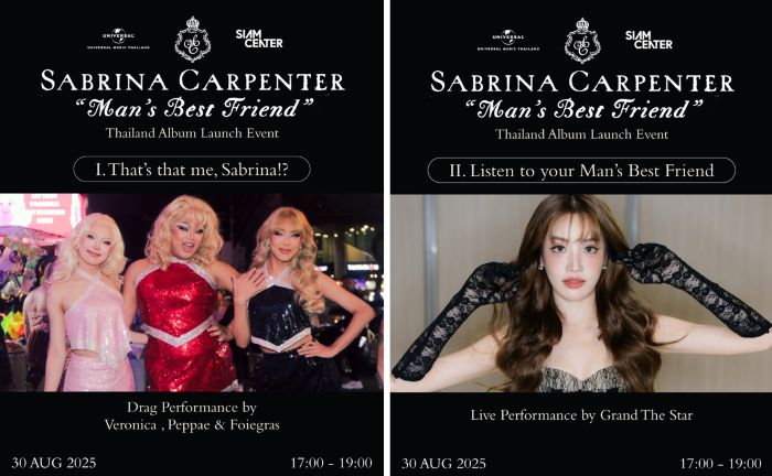 Sabrina Carpenter โกลบอลซูเปอร์สตาร์ เจ้าของสองรางวัลแกรมมี ได้ฤกษ์ปล่อยอัลบั้มใหม่ที่แฟน ๆ รอคอยอย่าง Man’s Best Friend ทั้งที เราก็ต้องฉลองให้สมฐานะ Universal Music Thailand จึงจัดอีเวนต์สุดยิ่งใหญ่ Sabrina Carpenter – Man’s Best Friend Thailand Album Launch Event ฉลองอัลบั้มใหม่ Man’s Best Friend ของ Sabrina Carpenter ที่แรกในประเทศไทย ใจกลางสยามเซ็นเตอร์ ให้แฟน ๆ ได้ฟินกันอย่างเต็มที่ ในวันที่ 30 สิงหาคมนี้