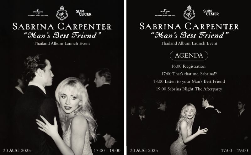 Sabrina Carpenter โกลบอลซูเปอร์สตาร์ เจ้าของสองรางวัลแกรมมี ได้ฤกษ์ปล่อยอัลบั้มใหม่ที่แฟน ๆ รอคอยอย่าง Man’s Best Friend ทั้งที เราก็ต้องฉลองให้สมฐานะ Universal Music Thailand จึงจัดอีเวนต์สุดยิ่งใหญ่ Sabrina Carpenter – Man’s Best Friend Thailand Album Launch Event ฉลองอัลบั้มใหม่ Man’s Best Friend ของ Sabrina Carpenter ที่แรกในประเทศไทย ใจกลางสยามเซ็นเตอร์ ให้แฟน ๆ ได้ฟินกันอย่างเต็มที่ ในวันที่ 30 สิงหาคมนี้