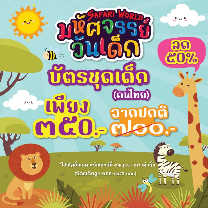 วันเด็กปีนี้ ซาฟารีเวิลด์มอบส่วนลดพิเศษสุดๆ..1 ปีมีครั้งเดียว! ต้อนรับวันเด็กแห่งชาติ 2568 ชวนน้องๆหนูๆมาเปิดโลกความสนุก กับการผจญภัยในซาฟารีเวิลด์ที่เนรมิตพื้นที่ทั้งปาร์คให้เป็นดินแดนแห่ง Baby Shark พร้อมรับโปรโมชั่นเฉพาะวันเด็กกับส่วนลดพิเศษถึง 2 ต่อ!! ต่อที่ 1 บัตรชุดเด็ก (คนไทย) ลด 50% จากปกติ 700 บาท เหลือเพียง 350 บาท ต่อที่ 2 “Meet and Greet” เก็บภาพสุดประทับใจแบบใกล้ชิดกับ 2 คาแรคเตอร์ยอดฮิตขวัญใจเด็กๆ Baby Shark และ Pinkfong ในราคาพิเศษเพียง 100 บาท (จากราคาปกติ 800 บาท)