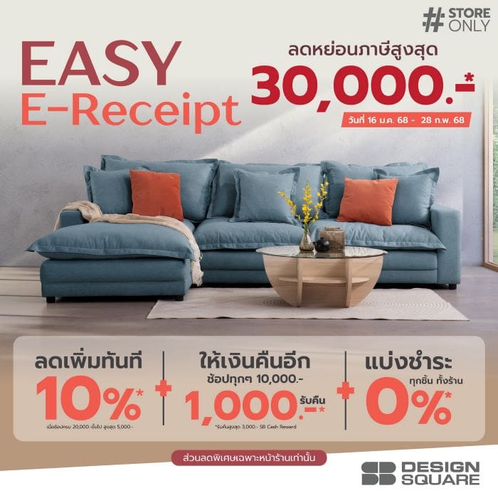 เอสบี ดีไซน์สแควร์ ขานรับนโยบายรัฐกับโครงการ “Easy E-Receipt 2.0” ช้อปเฟอร์นิเจอร์ลดหย่อนภาษีได้สูงสุด 30,000 บาท จากสิทธิ์ลดหย่อนสูงสุด 50,000 บาท ได้ทุกช่องทาง ที่เอสบี ดีไซน์ สแควร์ทุกสาขาทั่วประเทศตั้งแต่ 16 มกราคม – 28 กุมภาพันธ์นี้ พร้อมสร้างความคึกคักให้ตลาดเฟอร์นิเจอร์ด้วยแคมเปญดับเบิ้ลคุ้ม