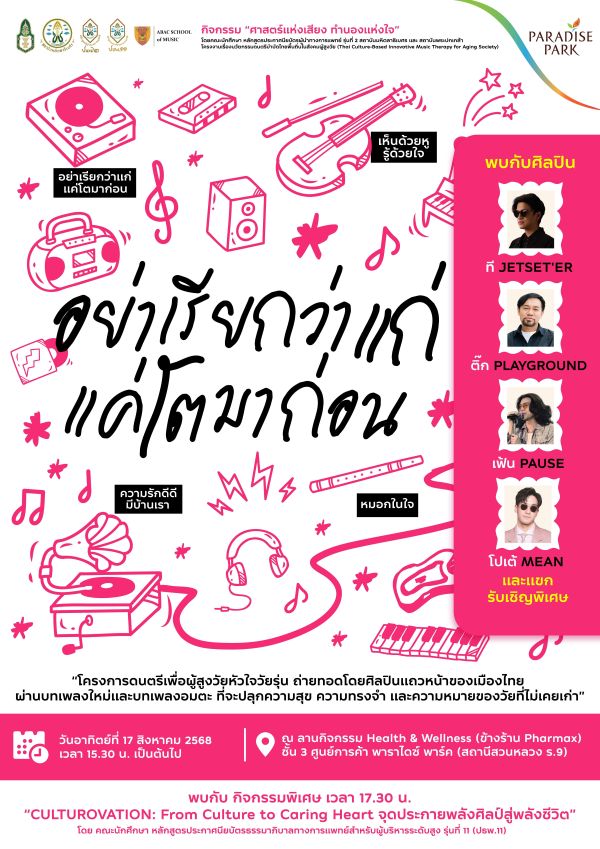 มาร่วมเป็นส่วนหนึ่งความทรงจำดี ๆ กับบทเพลงเติมพลังใจ ที่จะทำให้คุณรู้ว่า “วัย” ไม่ใช่ข้อจำกัดของความสุข ในงาน “ศาสตร์แห่งเสียง ทำนองแห่งใจ” วันอาทิตย์ที่ 17 สิงหาคม 2568 ตั้งแต่เวลา 16.00 น. – 19.00 น. ณ ลานกิจกรรม (ข้างร้าน Pharmax) ชั้น 3 ศูนย์การค้า พาราไดซ์ พาร์ค