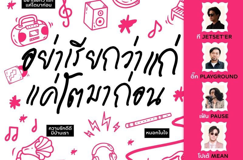 พบกับมินิคอนเสิร์ตสุดพิเศษ “อย่าเรียกว่าแก่ แค่โตมาก่อน” กับ 4 ศิลปินเสียงละมุนขวัญใจทุกยุค นำโดย “ที JETSET’ER” เจ้าของน้ำเสียงนุ่มละมุนและเสน่ห์เฉพาะตัว “ติ๊ก PLAYGROUND” เจ้าของเสียงร้องเปี่ยมอารมณ์กับเพลงที่คุ้นหู อย่างเพลง “มุม” “เฟ้น PAUSE“ หนึ่งในเสียงหลักของวง PAUSE ยุคใหม่ที่ยังคงกลิ่นอายความละมุนละไมแบบต้นฉบับ และ “โปเต้ MEAN” นักร้องเสียงเอกลักษณ์ ที่มาพร้อมสไตล์ดนตรีโมเดิร์นป๊อปที่โดดเด่นไม่ซ้ำใคร ที่จะมาเปิดตัว 4 เพลงใหม่ ในงานนี้ที่แรก รับรองว่าฟังแล้วยิ้ม อารมณ์ดี และอิ่มเอมใจ