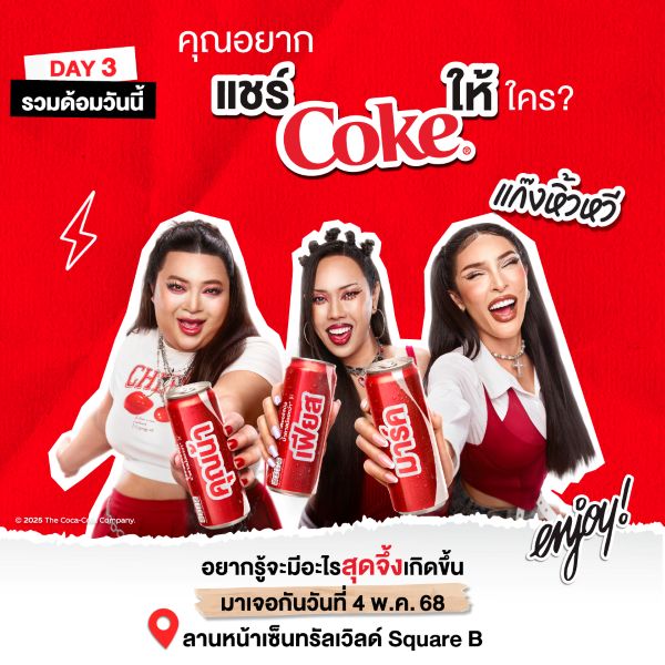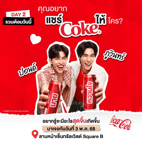 ศิลปินสุดฮอต พีพี–กฤษฏ์ อำนวยเดชกร ในฐานะ ตัวแทนครอบครัว “โค้ก” ชวน ออน–สมฤทัย รัตนวราห คอนเทนต์ครีเอเตอร์สุดฮอตเจ้าของวลีฮิต “แต้งกิ้ว คุณเทกี้” มาร่วมคอลแลปแบบเอ็กซ์คลูซีฟในแคมเปญระดับโลกอย่าง “ส่ง Coke ให้” ชวนคนรุ่นใหม่พักจากหน้าจอดิจิตอลแล้วมาสนุกไปด้วยกันนอกจอ ขยายความสนุกจากโลกดิจิตอลสู่ประสบการณ์จริงแบบจัดเต็ม กับงาน “โค้ก ชวนรวมด้อม” ซึ่งได้เนรมิตลานหน้าเซ็นทรัลเวิลด์ให้กลายเป็นพื้นที่แห่งความสนุก โดยมีแฟน ๆ ของทั้งสองมาให้กำลังใจอย่างเนืองแน่น พร้อมโซนกิจกรรมชวนครีเอท ๆ ทั้งออกแบบกระป๋อง “โค้ก” ในสไตล์ตัวเอง, ถ่ายรูปสุดชิคในโซนธีมเก๋ ๆ และแลนด์มาร์กกระป๋อง “โค้ก” LED ยักษ์ สำหรับแชร์โมเมนต์สุดพิเศษ สอดรับกับการส่งต่อความสุขผ่านการแชร์ “โค้ก” ที่อาจมีชื่อคุณ หรือชื่อคนที่คุณชื่นชอบอยู่บนบรรจุภัณฑ์
