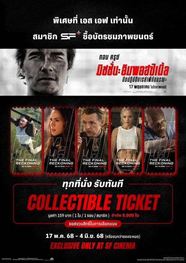 ● สมาชิก SF+ ที่ซื้อบัตรชมภาพยนตร์ “Mission: Impossible – The Final Reckoning” ทุกที่นั่งรับทันที SF+ Collectible Ticket ลิขสิทธิ์แท้จากภาพยนตร์ ( 1 ใบ / 1 รอบ / 1 สมาชิก ) มี 5 แบบให้สะสม ตั้งแต่วันที่ 17 พฤษภาคม – 4 มิถุนายน 2568 หรือจนกว่าสินค้าจะหมด