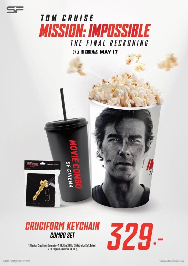 ● ห้ามพลาดกับ “Mission Impossible 8 Combo Set” คอมโบเซทสุดเอ็กซ์คลูซีฟลิขสิทธิ์แท้จากภาพยนตร์ ในราคาเพียง 329 บาท ภายในเซทประกอบด้วย แก้วน้ำพร้อมน้ำอัดลมขนาด 32 ออนซ์ 1 แก้ว ถังป๊อปคอร์นขนาด 64 ออนซ์ (สามารถเลือกรสชาติป๊อปคอร์นได้) และ Mission Cruciform Keychain พวงกุญแจสุดพรีเมี่ยมลิขสิทธิ์แท้จากภาพยนตร์ วางจำหน่ายตั้งแต่วันที่ 15 พฤษภาคม 2568 เป็นต้นไปจนกว่าสินค้าจะหมด ที่โรงภาพยนตร์ในเครือ เอส เอฟ ทุกสาขาทั่วประเทศ