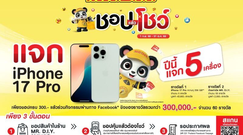 มิสเตอร์. ดี.ไอ.วาย. ชวนคนไทยร่วมสนุกกับกิจกรรม “ชอป แล้ว โชว์” แจก iPhone 17 Pro 5 เครื่อง พร้อมของรางวัลรวมกว่า 300,000 บาท