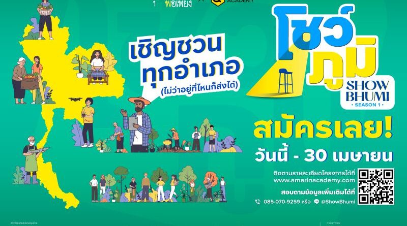 เปิดรับสมัครเข้าร่วมโครงการ “โชว์ภูมิ ซีซั่น 1” ตั้งแต่วันนี้ถึง 30 เม.ย. 69 ที่ www.amarinacademy.com/showbhumi สนใจหรือสอบถามข้อมูลเพิ่มเติมได้ที่ 085-0709259 หรือ Line OA: @ShowBhum มาร่วมด้วยช่วยกันเปลี่ยนแปลงและพัฒนาชุมชนของเราให้เป็นชุมชนที่เข้มแข็งและยั่งยืน