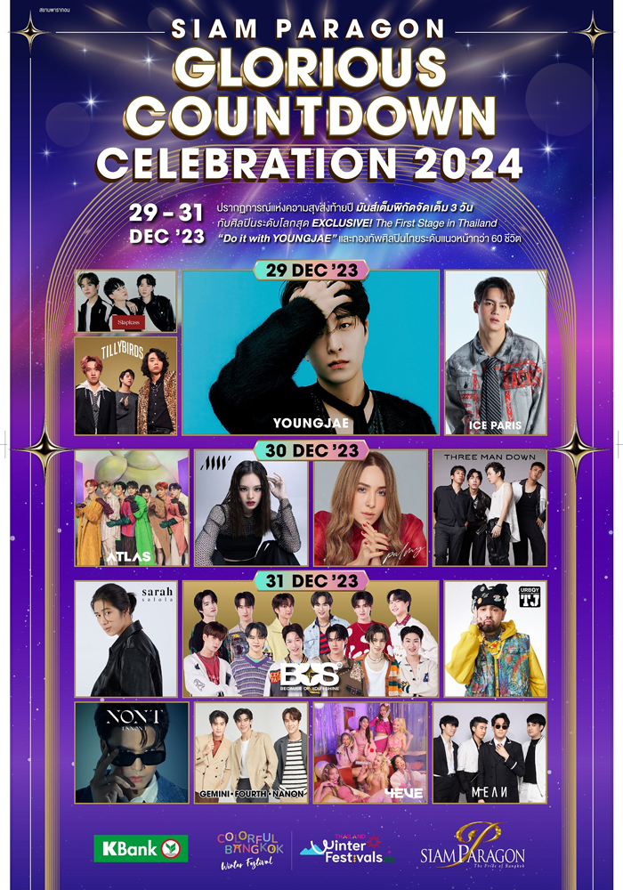 สยามพารากอน ศูนย์กลางการช้อปปิ้งระดับโลก (World Class Shopping Destination) ครองความเป็นที่ 1 ในใจ หรือ Top of Mind ของลูกค้าชาวไทยและนักท่องเที่ยวต่างชาติ ร่วมกับการท่องเที่ยวแห่งประเทศไทย (ททท.) และ ธนาคารกสิกรไทย มอบประสบการณ์สุดมหัศจรรย์เพื่อเป็นของขวัญในโอกาสพิเศษ จัดงาน “สยามพารากอน เดอะ กลอเรียส เคานต์ดาวน์ เซเลเบรชั่น 2024” (Siam Paragon The Glorious Countdown Celebration 2024) เปิดเวทีเคานต์ดาวน์สุดยิ่งใหญ่ก่อนใคร คว้าศิลปินเคป๊อปชื่อดังระดับโลก ชเว ยอง แจ หรือ ยองแจ GOT7 เมนโวคอล แห่ง GOT7 เปิดโชว์สุดพิเศษ ที่แรก!! และร่วมนับถอยหลังเข้าสู่ศักราชใหม่ 2024 ในวันศุกร์ที่ 29 ธันวาคม 2566 พร้อมยกทัพมหกรรมความบันเทิงเต็มรูปแบบ ด้วยคอนเสิร์ตแบบนอนสต็อป จากกองทัพศิลปินดังร่วมมอบความสุข ความประทับใจให้กับนักท่องเที่ยวทั้งชาวไทยและต่างชาติ อย่างเต็มอิ่มตลอด 3 วันเต็ม ระหว่างวันที่ 29-31 ธันวาคม 2566 ณ พาร์ค พารากอน ชั้น M สยามพารากอน เปิดเข้าชมฟรี! พร้อมมอบโปรโมชั่นสุดพิเศษแห่งปีและกิจกรรรมความสนุกทั่วทุกพื้นที่