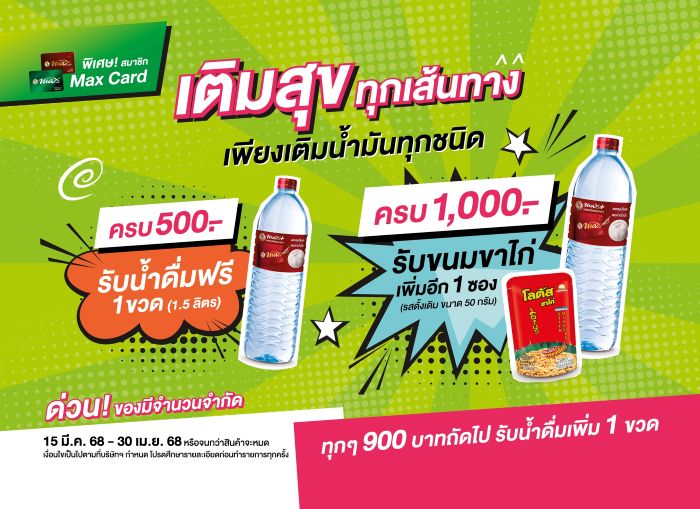 นายพร้อมศักดิ์ จรัญญากรณ์ กรรมการผู้จัดการ บริษัท แมกซ์ โซลูชัน เซอร์วิส จำกัด บริษัทในเครือ บมจ.พีทีจี เอ็นเนอร์ยี (PTG) กล่าวว่า “พีทีเพื่อนที่รู้ใจของคนใช้รถใช้ถนน อยากเติมความสุขในทุกเส้นทางให้คนไทย ด้วยโปรโมชันพิเศษสำหรับสมาชิก Max Card เพียงเติมน้ำมัน PT ชนิดใดก็ได้ครบ 500 บาท รับน้ำดื่มขวดใหญ่ ขนาด 1.5 ลิตร จำนวน 1 ขวด และถ้าเติมน้ำมันครบ 1,000 บาท จะได้รับขนมขาไก่โลตัส ขนาด 50 กรัม มูลค่า 12 บาท ฟรีอีก 1 ซอง และทุกการเติมน้ำมัน 900 บาท ถัดไป จะได้รับน้ำดื่มเพิ่มอีก 1 ขวด นับเป็นอีกโปรโมชันดีๆ ที่ทางพีทีตั้งใจให้ผู้ใช้รถใช้ถนนที่เดินทางช่วงใกล้เทศกาลหยุดยาว เต็มไปด้วยความสุข ความสดชื่น และความอร่อย”