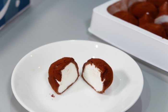 แลดูน่ารับประทานด้วยผงช็อกโกแลตที่โรยล้อมด้านนอก ส่วนด้านในมีสีขาวละมุนจากครีมสด ให้รสสัมผัสนุ่มละมุน และละลายทันทีที่รับประทาน