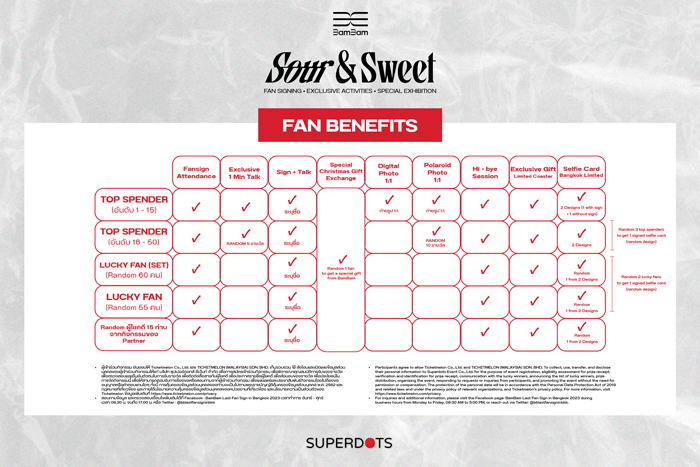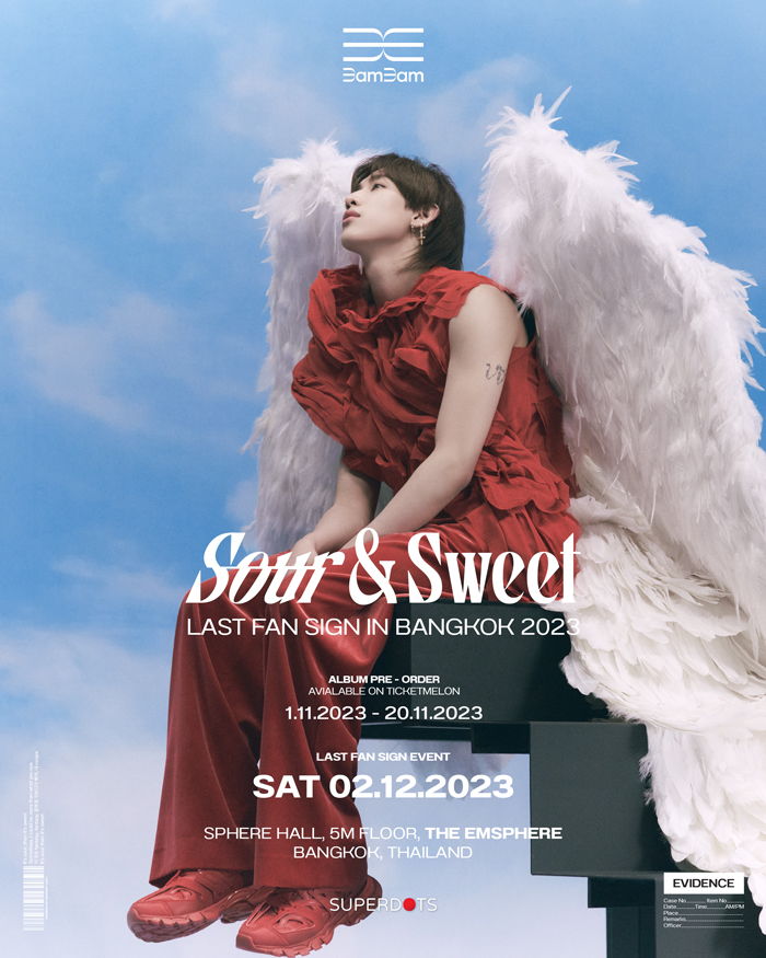 โดยงานนี้ ผู้จัดงานอีเว้นท์ชั้นนำอย่าง Superdots Events นำทีมโดย คุณณัฏฐ์วรจิต อุดมลิขิตวงศ์ และ คุณธนากร ประทีปแสนสุข เตรียมจัดเต็มกิจกรรมเอาใจเหล่าอากาเซ่ชาวไทยที่ซื้ออัลบั้ม “Sour & Sweet” เพื่อรับสิทธิเข้าร่วมกิจกรรม พร้อมมีโอกาสได้ใกล้ชิดกับหนุ่มแบมแบมแบบฟินสุดขีด กับงานแฟนไซน์ “BamBam Last Fan Sign in Bangkok 2023” ที่อัดแน่นไปด้วยกิจกรรมเฉลิมฉลองช่วงเวลาสุดพิเศษส่งท้ายปี ไม่ว่าจะเป็นกิจกรรมจับฉลากมอบของขวัญ Christmas และนิทรรศการ Sour & Sweet ครั้งแรกในประเทศไทย นอกจากนี้แบมแบม ยังเตรียมเซอร์ไพรส์สุดพิเศษ สำหรับงานนี้โดยเฉพาะอีกด้วย