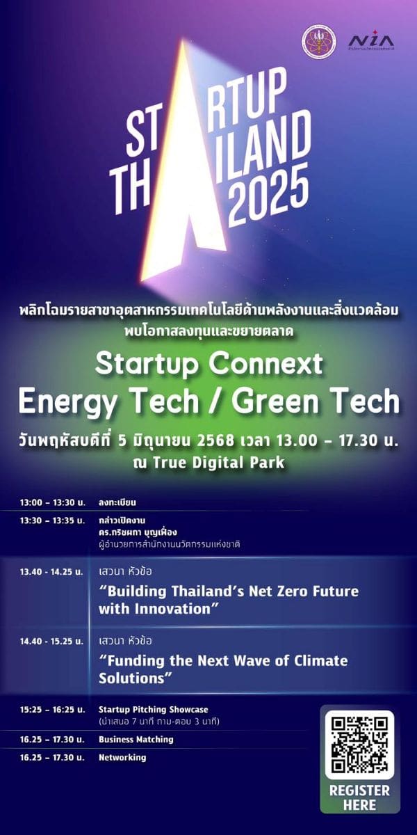 สำนักงานนวัตกรรมแห่งชาติ (องค์การมหาชน) หรือ NIA เตรียมจัดงาน “Startup Thailand 2025: Connext #GreenTech-EnergyTech” เวทีสำคัญสำหรับ สตาร์ตอัปสายพลังงานและเทคโนโลยีสีเขียว ที่มุ่งเน้นการสร้างนวัตกรรมเพื่อความยั่งยืน โดยเปิดโอกาสให้สตาร์ตอัป นักลงทุน หน่วยงานภาครัฐ และภาคเอกชน ได้เชื่อมโยงความร่วมมือด้านธุรกิจ การตลาด และการลงทุน พร้อมกิจกรรมเข้มข้นตลอดทั้งวัน