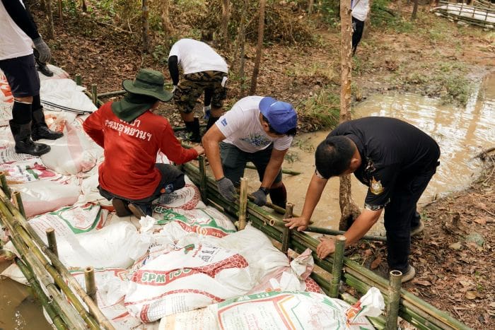 2. การสร้างฝายคอกหมูชะลอน้ำ ซึ่งเกิดจากภูมิปัญญาชาวบ้าน โดยก่อสร้างด้วยท่อนไม้ขนาบด้วยถุงบรรจุทราย เพื่อช่วยกักเก็บน้ำ ลดการพังทลายของหน้าดิน และดักจับตะกอนที่ไหลมากับสายน้ำ ช่วยให้แหล่งน้ำในพื้นที่ตอนล่างเกิดการตื้นเขินช้าลง ช่วยให้ดินชุ่มชื้น ป่ามีความอุดมสมบูรณ์ เพิ่มความหลากหลายทางชีวภาพ สัตว์ป่า สัตว์น้ำ ได้อาศัยน้ำในการดำรงชีวิต
