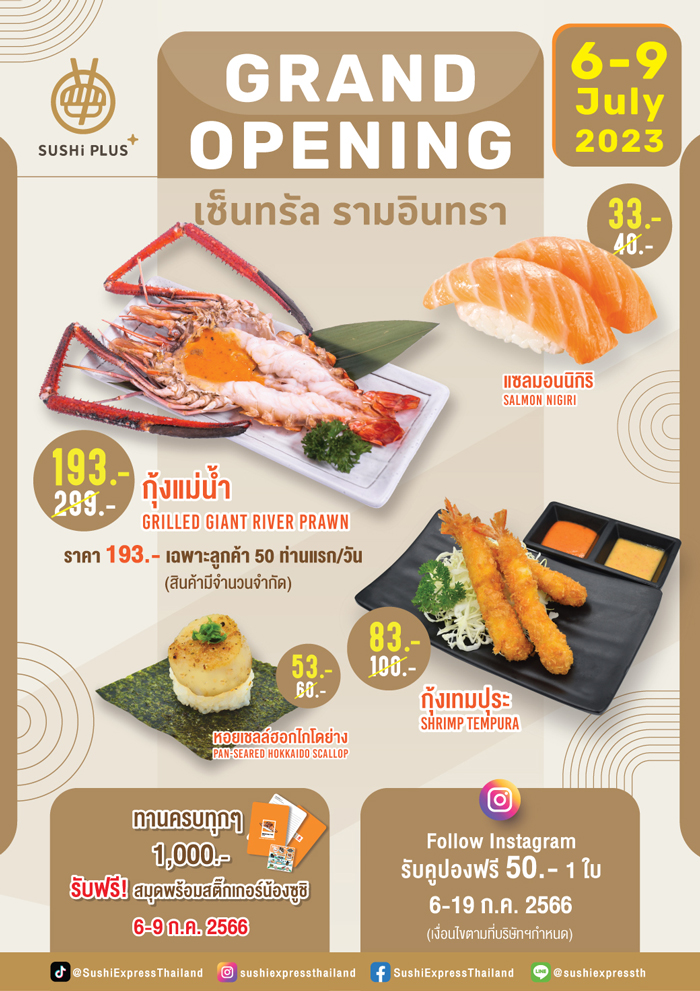 ชาวรามอินทรา พร้อมยัง #SUSHiPLUS By Sushi Express สาขา เซ็นทรัล รามอินทรา ชั้น 3 ซูชิสายพานเกรดพรีเมียม ราคาเริ่มต้นเพียง 30 บาทเท่านั้น จัดโปรโมชั่นพิเศษในช่วง Grand Opening วันที่ 6-9 กรกฎาคม 2566