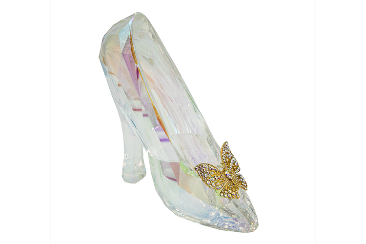 สร้างสรรค์โดยช่างฝีมือของสวารอฟสกี้ที่สำนักงานใหญ่ในเทือกเขาแอลป์ ประเทศออสเตรีย รองเท้าแก้วอันเป็นเอกลักษณ์ของซินเดอเรลล่าเป็นอีกหนึ่งองค์ประกอบที่สมบูรณ์แบบ เพื่อรำลึกถึงมรดกแห่งความสุขและแสงสว่างของดิสนีย์ รองเท้าแก้วประกอบด้วยการเจียระไน 221 เหลี่ยม และตัดจากคริสตัลออโรรา บอเรลลีส (Aurora Borealis) ซึ่งมีคุณสมบัติสะท้อนแสงอันเป็นเอกลักษณ์และเปล่งประกายระยิบระยับมหัศจรรย์ นำเสนอผลงานอันวิจิตรงดงามของสวารอฟสกี้ โดยทีมช่างแปดคน ที่ใช้เวลาสรรค์สร้างร่วม 150 ชั่วโมง