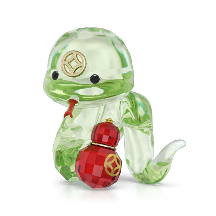 การตีความอันแสนมีชีวิตชีวาต่อสัญลักษณ์ที่เราคุ้นเคยนี้ได้ถูกสื่อออกมาในรูปแบบของคริสตัล ซึ่งสะท้อนถึงการเฉลิมฉลองปีแห่งงู รูปปั้นงูสีเขียวชิ้นนี้ได้รับการเจียระไรกว่า 398 เหลี่ยมมุม ทำให้ดูมีบุคลิกที่ยากจะต้านทาน ด้วยลิ้นโลหะสีแดง กระเป๋าโลหะโทนสีทองแชมเปญ และสัญลักษณ์ฮูลูที่ประดับอยู่บนหน้าผาก