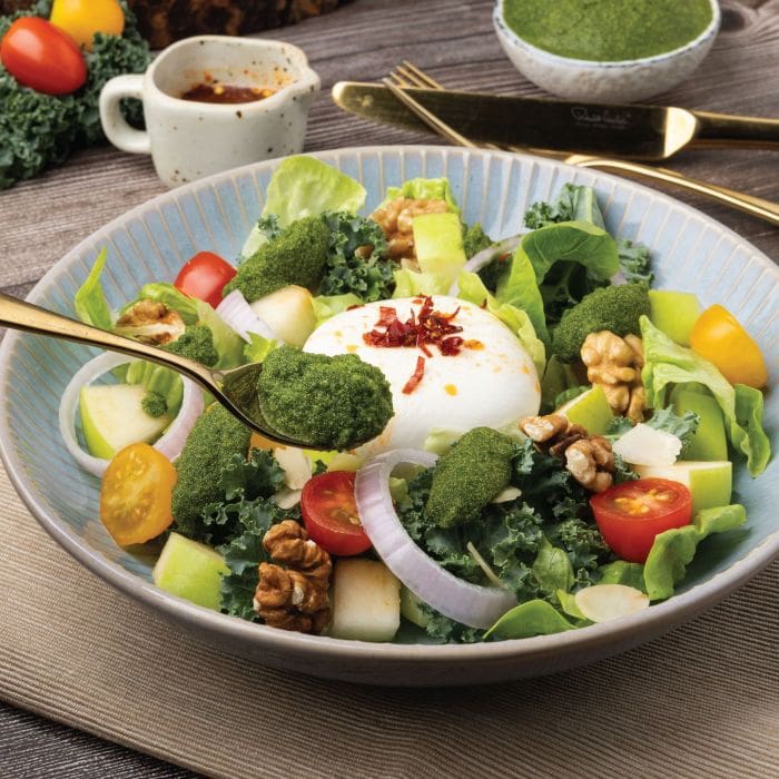 สลัดผักสดกรอบ ธัญพืช ถั่วหลากชนิด และชีสบูราต้านุ่มนวล ราดด้วยน้ำสลัดน้ำผึ้งรสเผ็ดหวาน ตัดรสชาติได้อย่างลงตัว เติมเต็มด้วยไข่ผำเพื่อความสดชื่นและดีต่อสุขภาพ