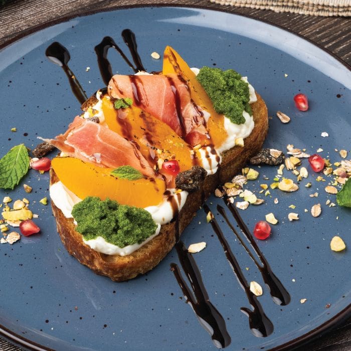 โทสต์ซาวโดว์อบกรอบ หน้าแฮมเซอร์ราโน ลูกพีชที่นำมาย่าง พร้อมโยเกิร์ต กราโนล่าและไข่ผำ ที่มอบรสชาติหวาน เค็ม มัน ครบถ้วนในคำเดียว